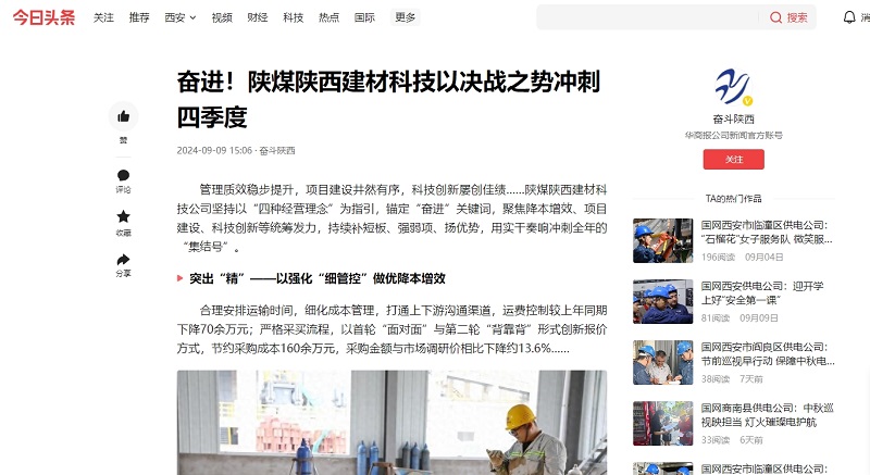 今日頭條、二三里 | 奮進(jìn)!陜煤陜西建材科技以決戰之勢沖刺四季度